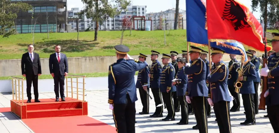 Kosova Savunma Bakanı Ejup Maqedonci, Arnavutluk Savunma Bakanı Ermal Nufi’ni askeri törenle karşıladı.